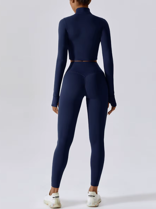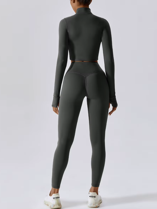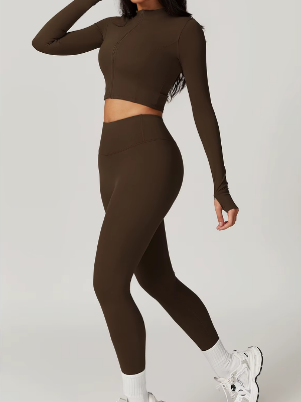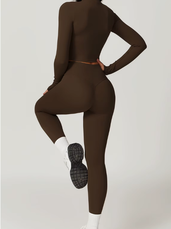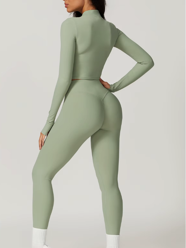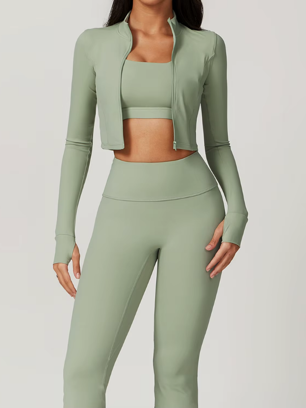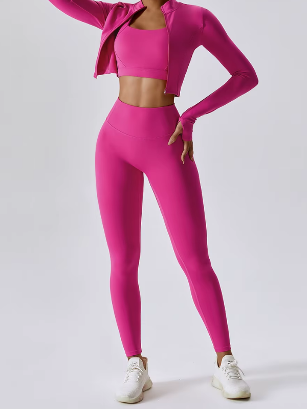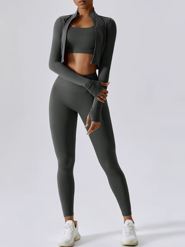 Ensemble 3 pièces avec brassière, legging taille haute et veste zippée courte. Un look polyvalent et performant, pensé pour l’entraînement intense comme pour un style athleisure raffiné.